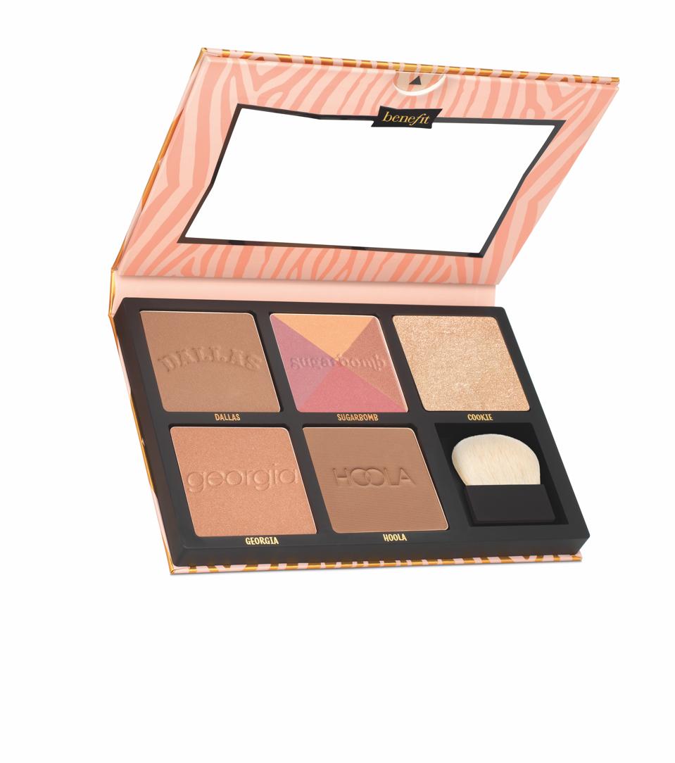 La paleta con el nombre perfecto es como tu banda favorita volviendo a estar juntos, pero con algunos miembros nuevos. Incluye los clásicos de Benefit Cookie, un iluminador de perlas doradas y el bronceador mate favorito de los fans, Hoola. Los recién llegados son Dallas, un rubor bronceado rosado; Sugarbomb, un rubor rosado rosado; y Georgia, un rubor melocotón dorado. Los cinco tonos son de tamaño completo y se incluye un cepillo para mejillas. $ 60, beneficiocosméticos.com