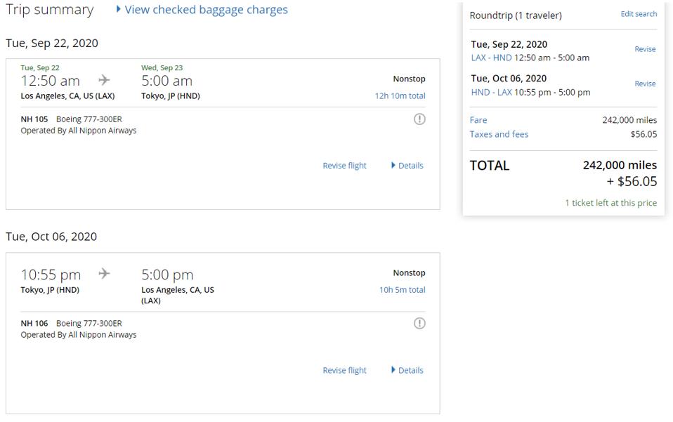 De plus, n’oubliez pas les partenariats sans alliance. Par exemple, United facture désormais 242 000 miles MileagePlus pour une prime aller-retour en première classe ANA entre Los Angeles (LAX) et Tokyo (HND):