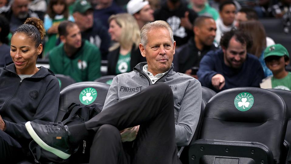 ボストン-10月5日:ボストンセルティックスのゼネラルマネージャーであるダニーエインジが、2019年10月5日にボストンのTD …ガーデンで開かれた練習中に見守っています。(写真提供:John Tlumacki / The Boston Globe via Getty Images)